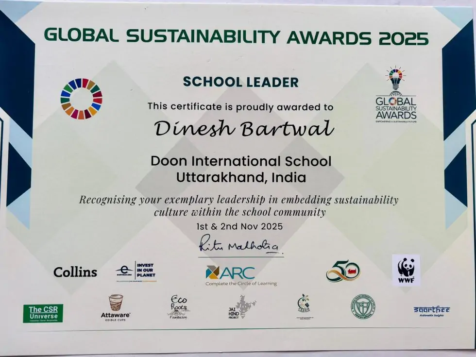 देहरादून: दून इंटरनेशनल स्कूल, देहरादून के प्रिंसिपल डॉ. दिनेश बर्त्वाल को दिल्ली में प्रतिष्ठित ग्लोबल सस्टेनेबल अवार्ड से सम्मानित किया गया।
