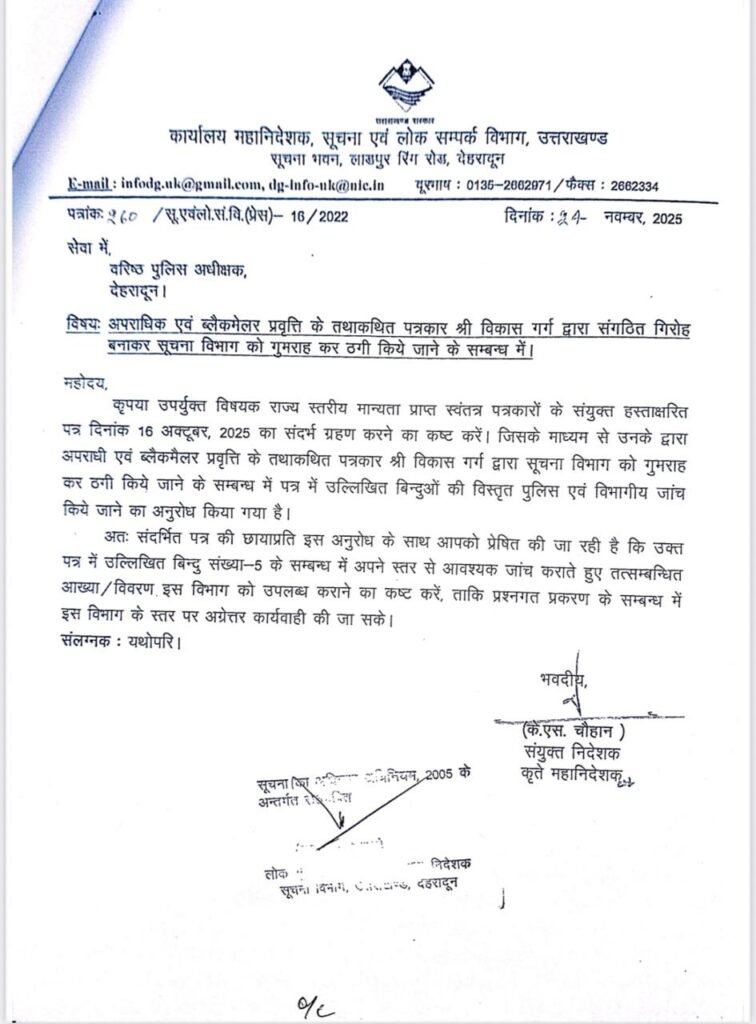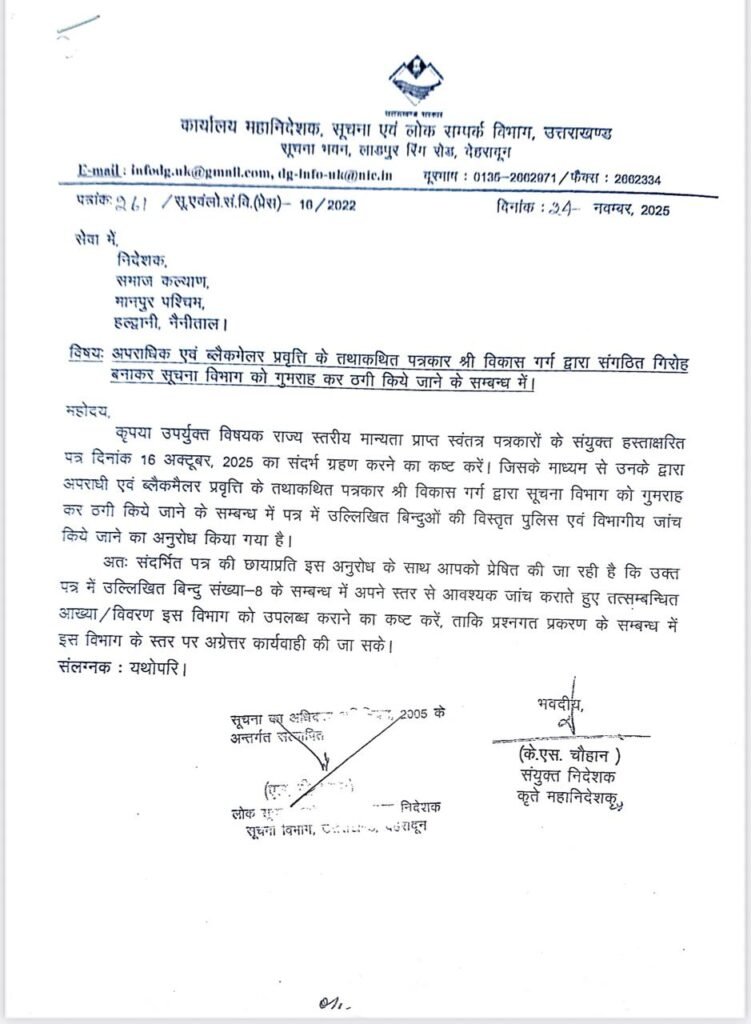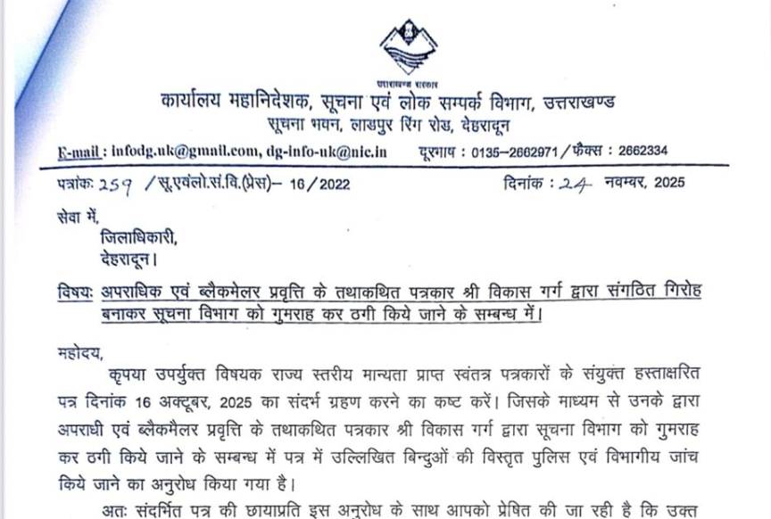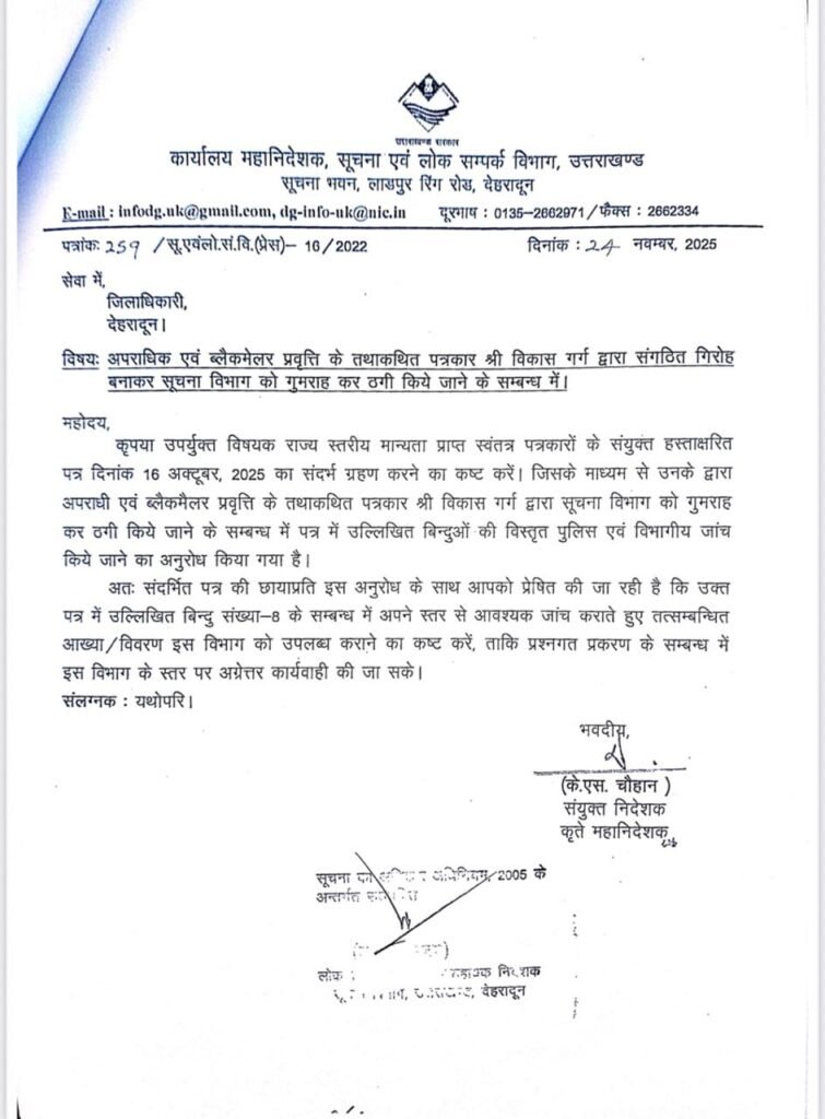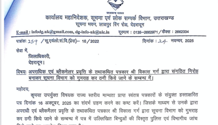 उत्तराखंड सूचना विभाग ने कथाकथित पत्रकार विकास गर्ग के खिलाफ जांच को लिखा पत्र
