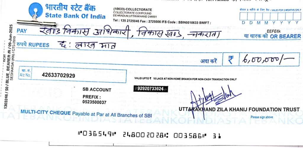 खण्ड विकास अधिकारी, विकासखण्ड चकराता द्वारा खेल मैदान के समतलीकरण हेतु रु० 9.40 लाख की अनुमानित लागत प्रस्तुत की गई, जिसे जिलाधिकारी के निर्देशानुसार जिला खनिज फाउंडेशन न्यास की शासी परिषद के समक्ष परीक्षण एवं संस्तुति हेतु प्रस्तुत किया गया।शासी परिषद के अध्यक्ष एवं अन्य सदस्यों द्वारा प्रस्ताव पर अनुमोदन प्रदान करते हुए कुल रु० 10.00 लाख (रुपये दस लाख मात्र) की स्वीकृति दी गई है, जिसमें से 60 प्रतिशत अर्थात रु 6,00,000/- (रुपये छः लाख मात्र) की धनराशि प्रथम किस्त के रूप में खण्ड विकास अधिकारी, विकासखण्ड चकराता को निर्गत किए जाने हेतु जिला खनिज फाउंडेशन न्यास के निर्धारित बैंक खाते से चैक तैयार किया गया है। शेष 40 प्रतिशत अर्थात रु० 4,00,000/- (रुपये चार लाख मात्र) की धनराशि उपयोगिता प्रमाण पत्र प्रस्तुत किए जाने एवं तृतीय पक्ष द्वारा जाँच आख्या प्राप्त होने के उपरान्त निर्गत की जाएगी।