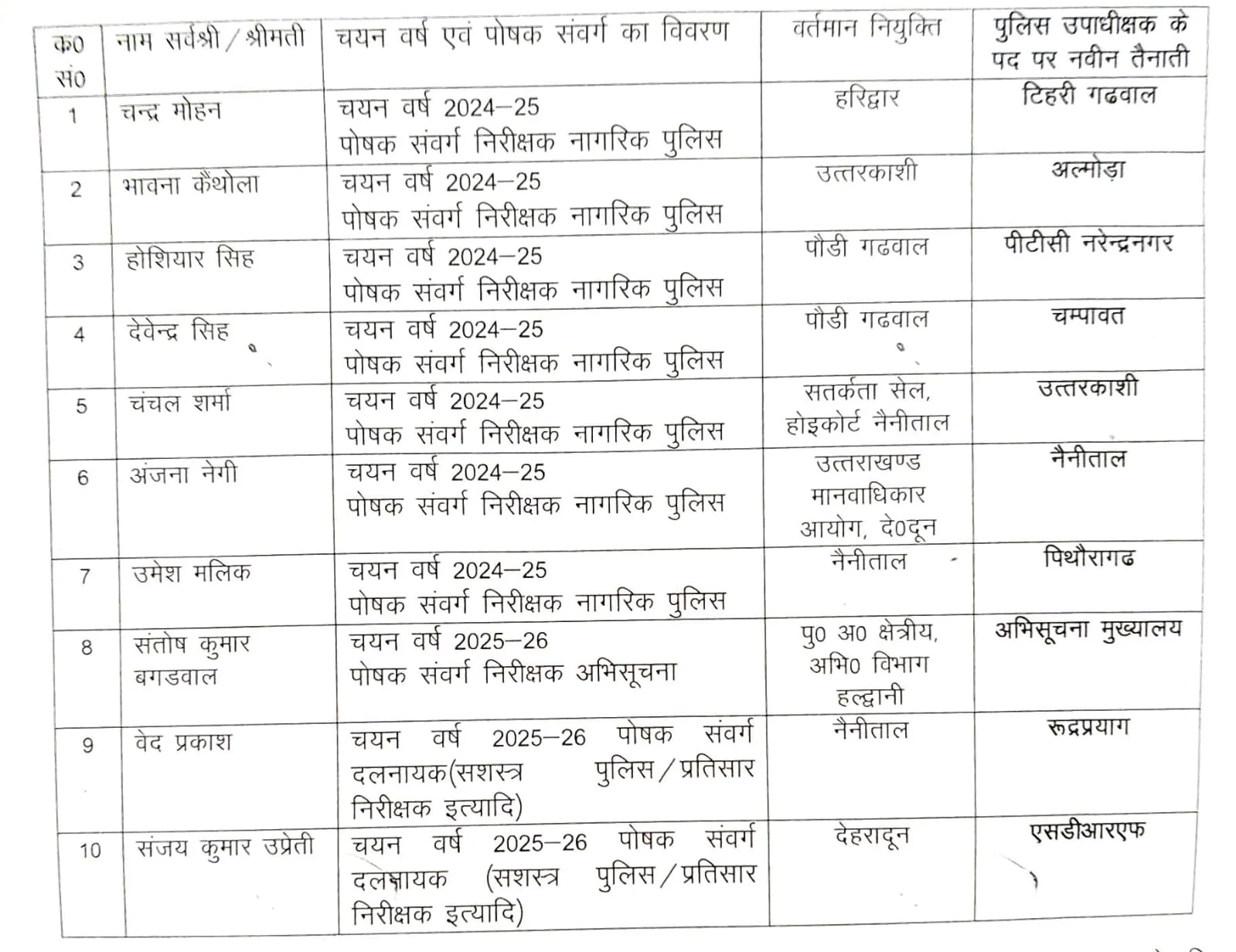 पुलिस मुख्यालय ने 5 पुलिस उपाधीक्षकों का स्थानांतरण भी किया है। स्थानांतरित होने वाले पुलिस उपाधीक्षकों में अनुज, जीआरपी हरिद्वार, अनुज कुमार, देहरादून, रीना राठौर, आईआरबी-द्वितीय देहरादून और विमल प्रसाद, चम्पावत और नितिन लोहानी, देहरादून के नाम शामिल हैं।