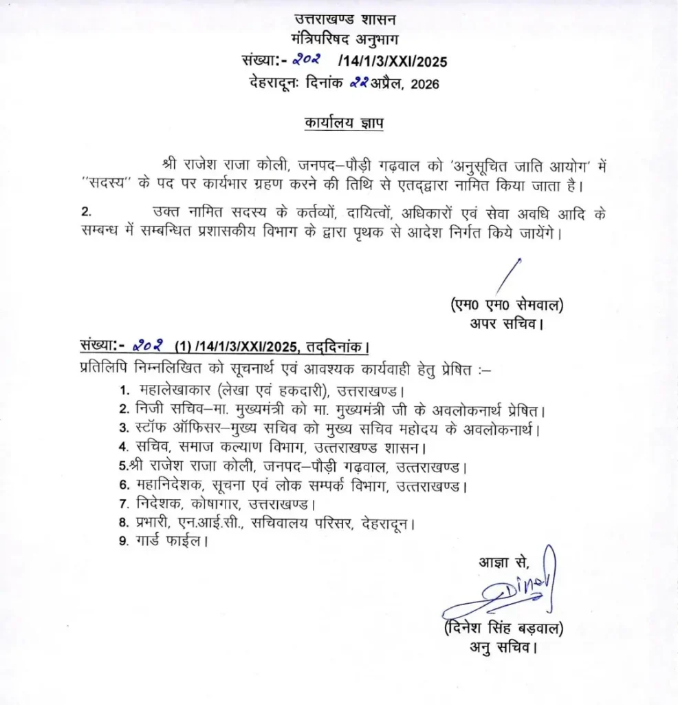 राजा कोली बने उत्तराखंड अनुसूचित जाति आयोग के सदस्य