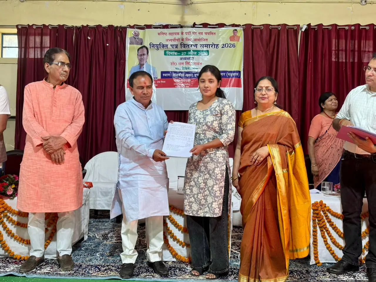 श्रीनगर: उत्तराखंड अधीनस्थ सेवा चयन आयोग की परीक्षा उत्तीर्ण करने के उपरांत गढ़वाल मंडल हेतु चयनित 44 कनिष्ठ सहायकों के नियुक्ति पत्र वितरण का भव्य समारोह श्रीनगर स्थित पी.एम. श्री राजकीय बालिका इंटर कॉलेज में संपन्न हुआ। कार्यक्रम के मुख्य अतिथि कैबिनेट मंत्री डॉ. धन सिंह रावत (विद्यालयी शिक्षा, सहकारिता, उच्च शिक्षा एवं तकनीकी शिक्षा, उत्तराखंड सरकार) द्वारा चयनित अभ्यर्थियों को नियुक्ति पत्र वितरित किए गए।